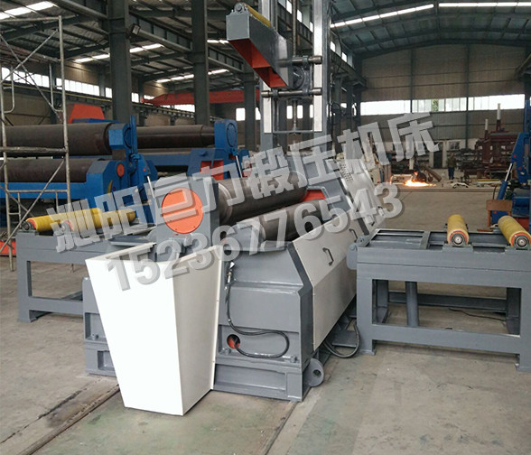 該四輥卷板機(jī)與對稱三輥卷板機(jī)比較,它可以不借助其它設(shè)備模具,直接予彎板材端部,而且剩余直邊較??;它可以不使板材調(diào)頭,而卷成工件。
